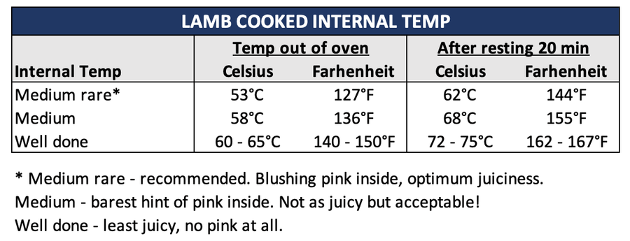Rest 20 minutes – Rest the lamb for 20 minutes before carving. During this resting stage, the lamb finishes cooking and the internal temperature will rise to 62°C/144°F which is perfect medium rare for lamb.