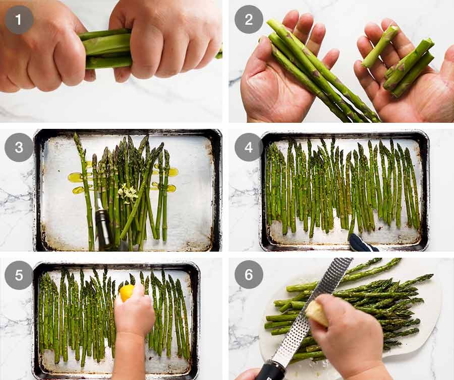 - Snap the woody ends off the asparagus – it will naturally break at the right point.