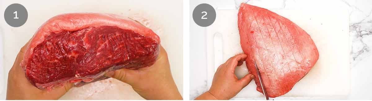 - Score the fat cap with 2.5cm / 1" diamonds – cut well into the fat but don't cut into the meat. (But not a disaster if you do, unlike pork crackling!)