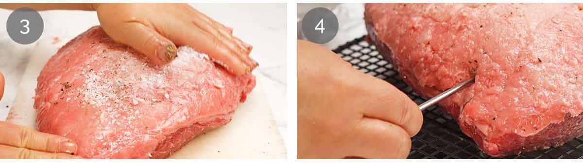 - Rub salt – Rub the meat surface with 2 teaspoons of the salt and half the pepper (ie underside and sides). Then rub the remaining 3 teaspoons of salt and pepper into the fat cap.