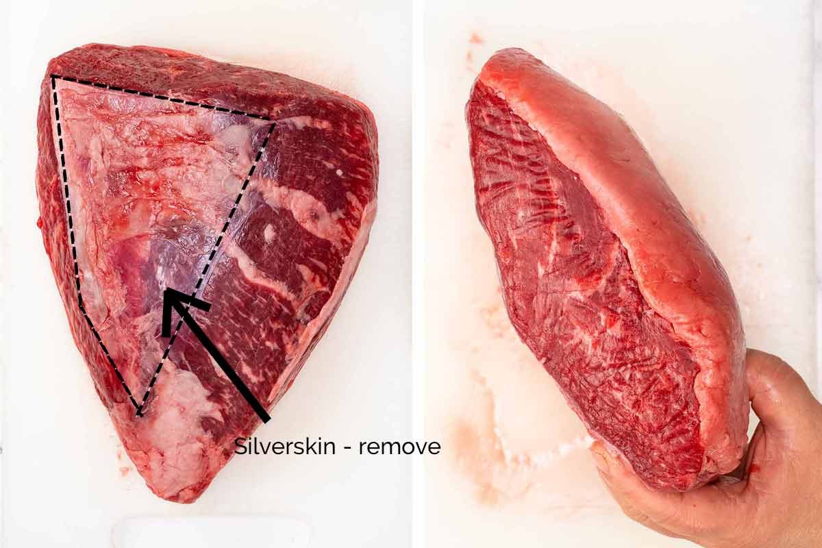 Silverskin – If your rump cap still has silver skin on it (the see-through skin on the underside that looks “silver”), cut it off as this can become tough. See diagram below with the silver skin area marked (be aware of sneaky silver skin hiding under fat!).