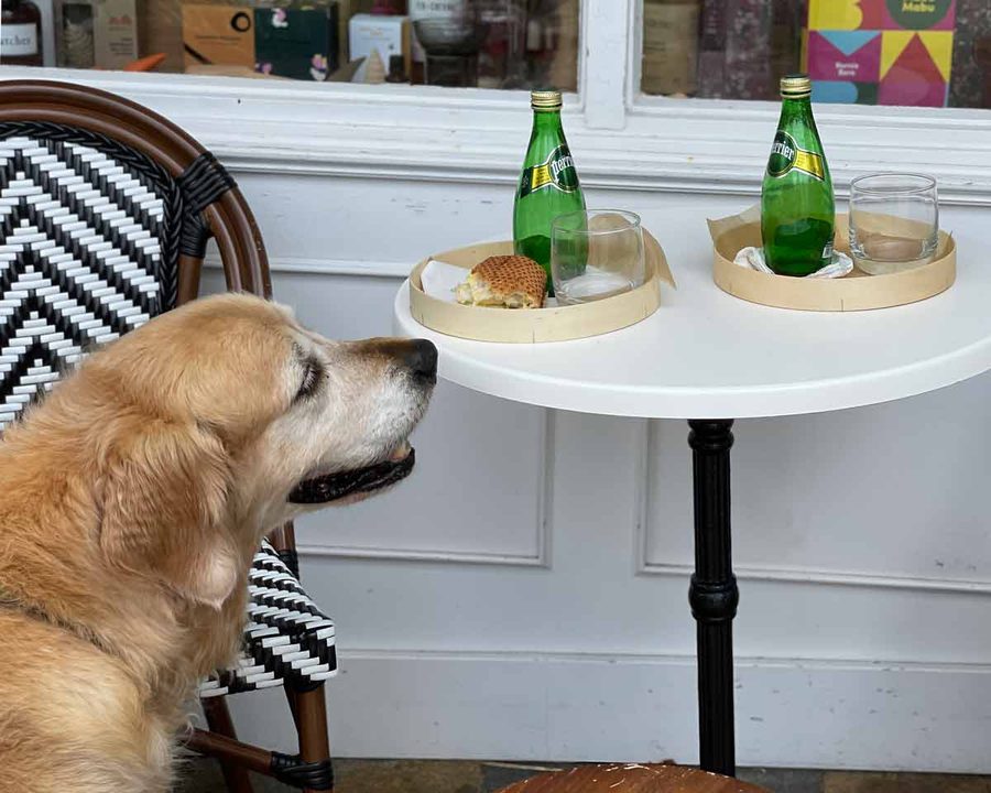 When Dozer spies leftovers on a random cafe table, I stand no chance of holding him back. #Scavenger