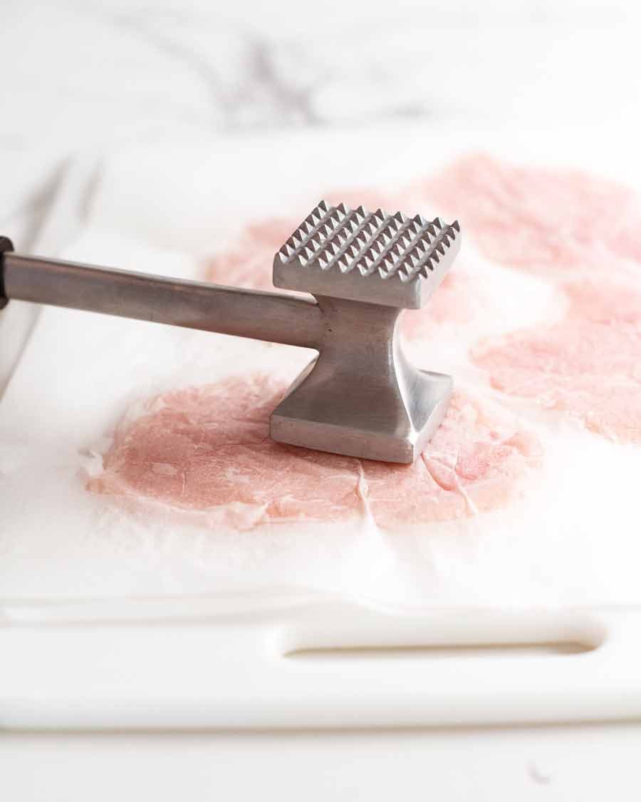 Best way to pound meat: Place the veal between 2 freezer bags, baking paper (parchment paper) or purpose-made plastic sheets called “Go-Between*” (pictured, see below) to protect the meat. Then use a meat mallet or rolling pin to pound the veal gently and evenly so it flattens uniformly.