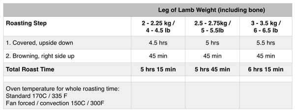 - Slow roast: Place in the oven and roast for 4.5 hours. (See Notes for roasting time table)