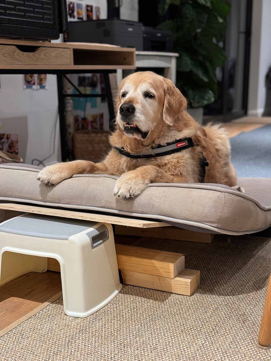 I also position him on an incline for 30 minutes after every meal to let gravity help get the food into his stomach. (There are purpose built contraptions called “Bailey Chairs” but for a dog of Dozer’s size plus given his spine condition, it’s not suitable for him).