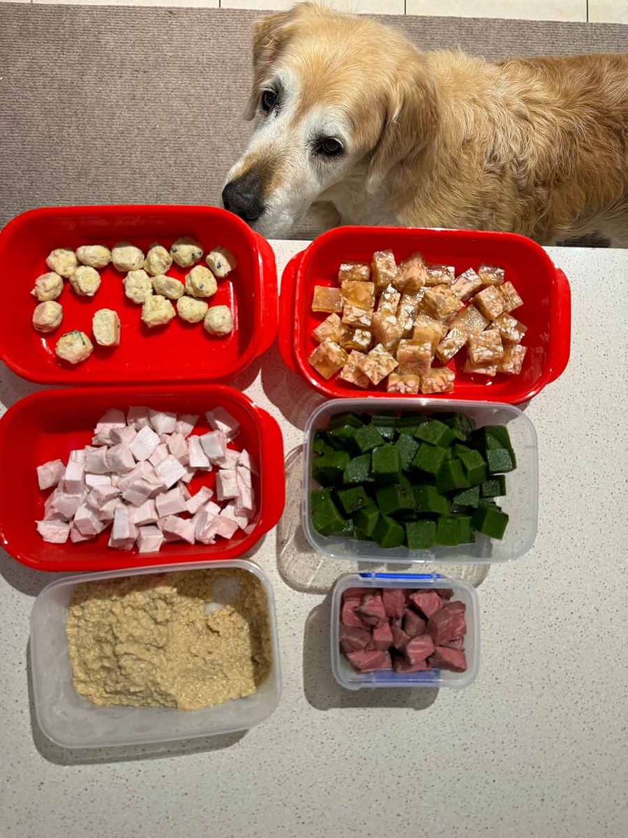 I haven’t solved the new Dozer food challenge yet. I’ve been trying all sorts of things, from sou vide meat (the moistness of the cubes of meat makes it easy to slide down his throat), to a dog friendly terrine (this is showing potential!) to porridge-like slop (I just can’t bring myself to feed this to him..)