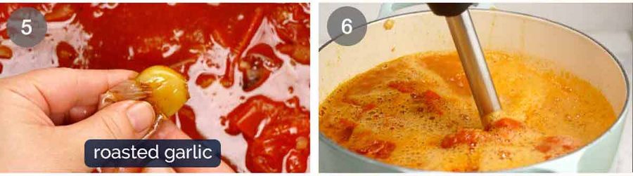 - Tomatoes – Remove the garlic cloves from the baking tray. Scrape all the tomatoes and juices into the pot. Squeeze garlic flesh into the pot. Add vegetable stock.