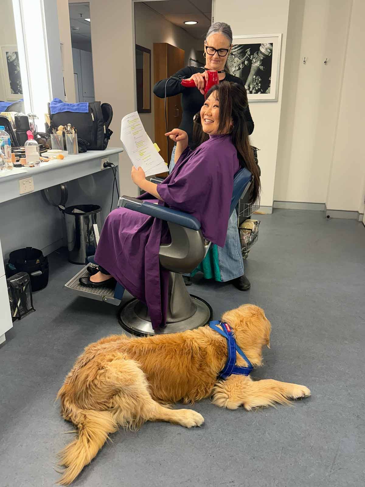 And there I am, frantically learning my lines while getting a blow-out (Dozer was up next).