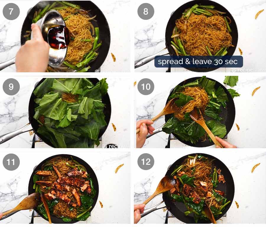 Leave 30 seconds – Once the sauce is absorbed again, spread the noodles out and leave them undisturbed for 30 seconds. This encourages caramelisation of the noodles, compared to constantly tossing. Repeat this 3 to 4 times until you see the noodles get some nice colour on them.