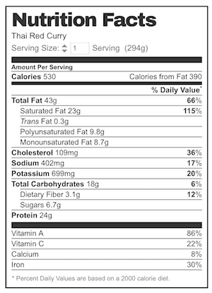 Stuff in it: There are no hard and fast rules about what goes into a Thai Red Curry. You’ll find Thai eggplant in curries at very authentic Thai restaurants but to be honest, I am not a huge fan of them – they are like tiny eggplants and kind of hard (also not easy to find in shops). I’d say that the two most common vegetables I’ve noticed are pumpkin and green beans or snake beans. While pumpkin may not sound “Thai”, don’t dismiss it, it is spectacular in red curry for both the texture, the sweetness and also because it soaks up the sauce. 8. Nutrition per serving, curry only.