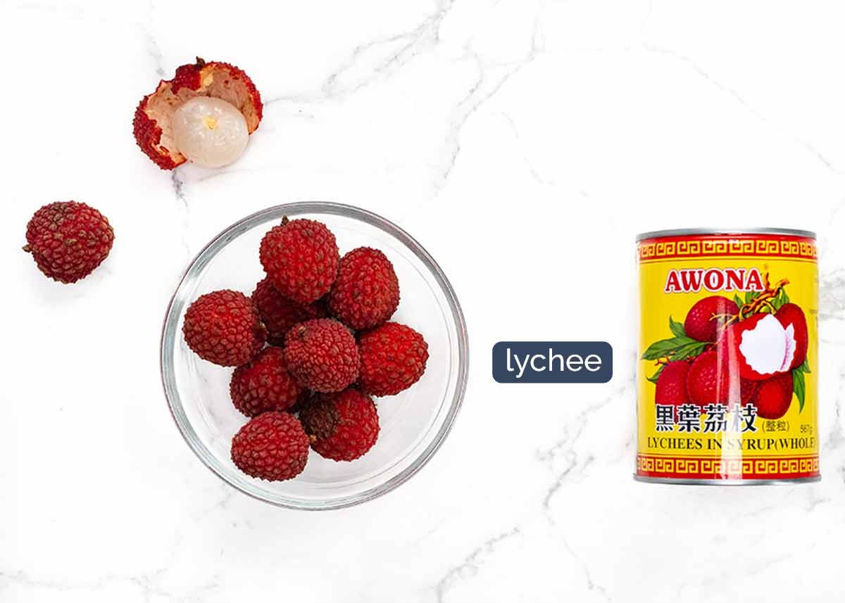 - 8 – 12 lychees , whole, peeled, seed removed. Fresh best, canned ok too! (Note 7)