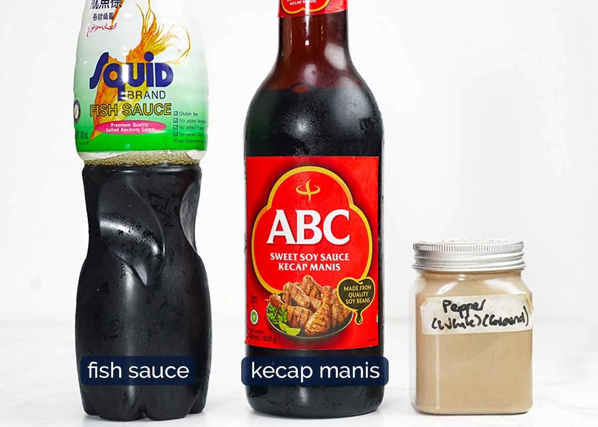 Sauce – Mix the kecap manis, fish sauce and pepper (if using) together until the syrupy kecap manis is dissolved.