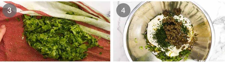 Really try to squeeze as much water as you can out of the cucumber else it will dilute the tzatziki and make it watery.