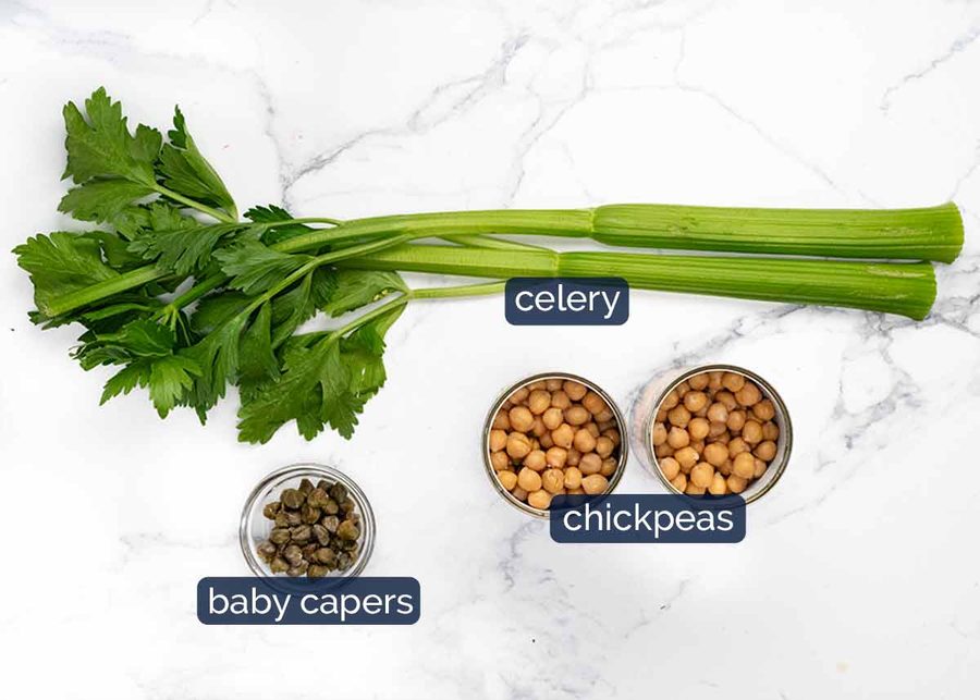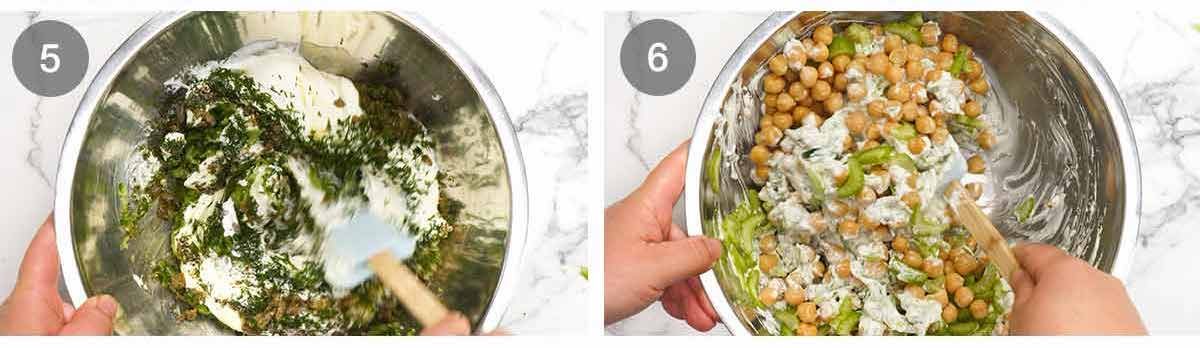 - Mix – Put the Tzatziki ingredients in a big bowl and mix. Add the chickpeas, celery and capers, mix again.