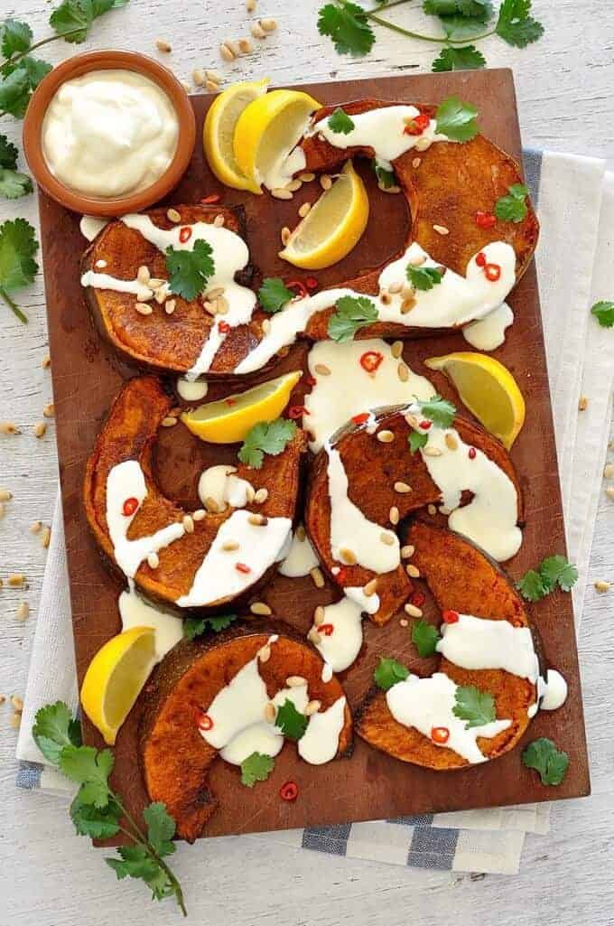 When the pumpkin is cooked, remove from baking tray and place on serving platter. Drizzle over lemon juice. Rest for 5 to 10 minutes before garnishing.