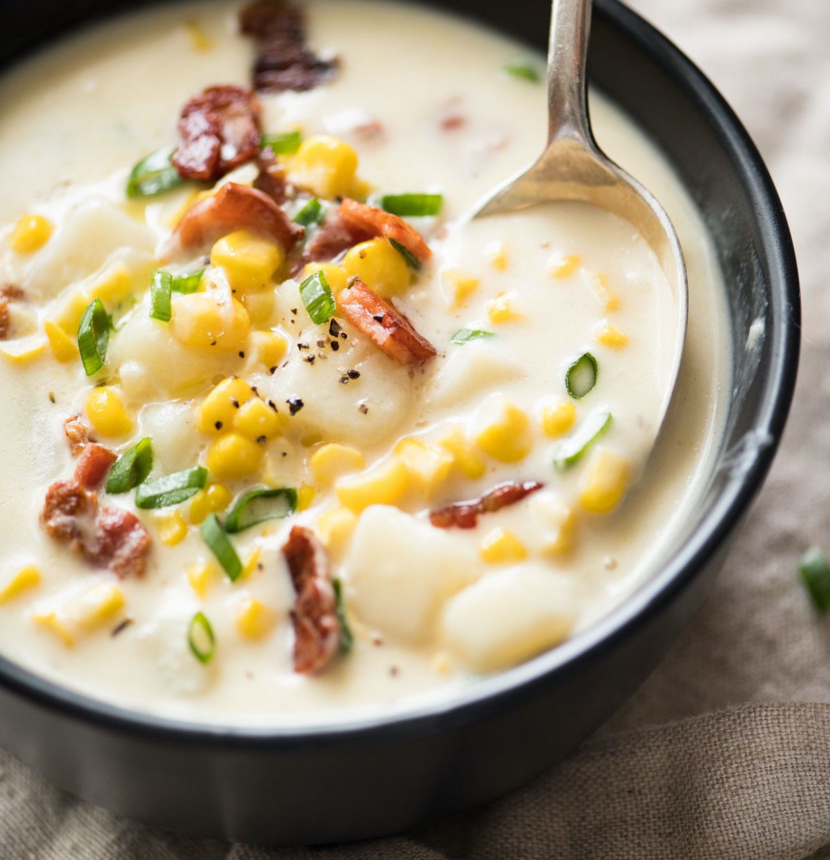 Recipe video above. Make your next Corn Chowder extra tasty by using the bacon drippings to make the soup base and after cutting the kernels off, throw the corn cobs into the broth to infuse it with extra corn flavour! The potato is cooked until very soft, so the edges are starting to breakdown and this helps thicken the soup.