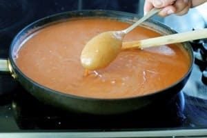 Add the milk and whisk for 1 minute, in small circles around the fry pan, until it starts to thicken. Then add the tomato passata, water, salt and pepper. Increase the heat to medium high and cook for around 5 minutes or until thick enough to coat the back of a metal spoon (see photo below). Whisk occasionally for the first 3 minutes, then whisk constantly for the last 2 minutes.