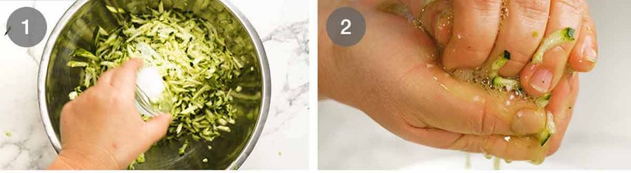 Sweat 20 minutes – Sprinkle the grated zucchini with salt and toss. Set aside for 20 minutes to draw water out.