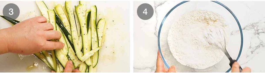 - Decorative zucchini – Finely slice the 3rd zucchini however you want, to decorate the surface. I cut the zucchini in half then into long strips. Thin coins is also nice. Toss with the oil and pepper.
