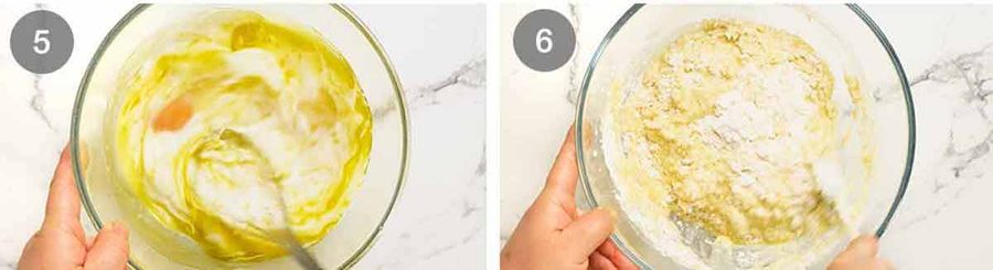 - Batter – Whisk the Dry ingredients in a large bowl using a handheld whisk. Make a well in the centre. Whisk the Wet ingredients in a separate bowl until combined. Pour the Wet into the Dry ingredients. Mix using a wooden spoon until the flour is mostly incorporated but there's still flour visible.